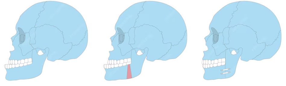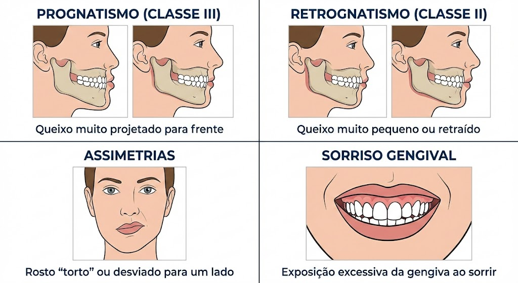 Basicamente, quando os ossos da face não crescem na proporção correta, os dentes não se encaixam, consequentemente, surgem problemas graves de saúde, por isso, o cirurgião interfere para colocar a maxila e a mandíbula na posição ideal.